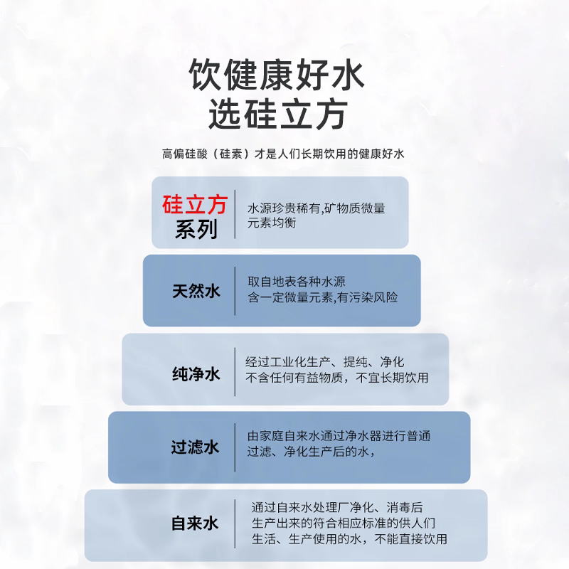 作为“真硅水”的核心标识,硅立方真硅水的偏硅酸含量经长期检测稳定在**150mg/L以上**,远超饮用天然矿泉水的国家标准界限指标,属于典型的“高偏硅酸水”。偏硅酸作为人体必需的有益矿物质,不仅能为骨骼、关节健康提供支持,还能助力维持血管弹性,日常饮用时无需额外补充,就能在补水过程中轻松获取“硅能量”,让健康融入生活细节。